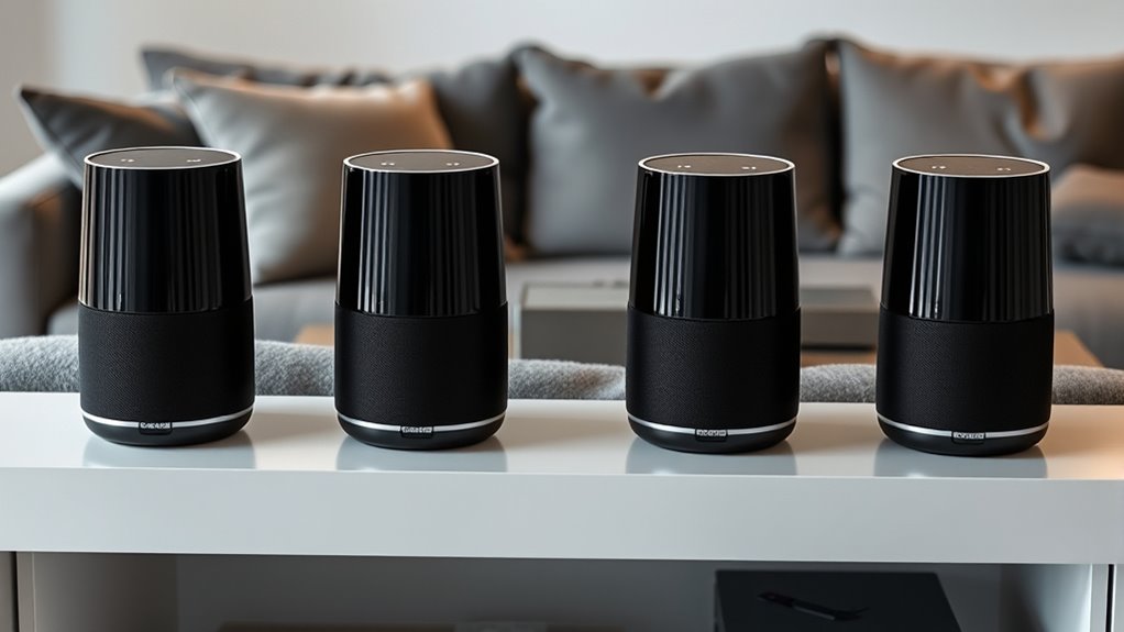 Choosing a premium Echo Studio speaker system means paying close attention to sound quality precision, which is essential for an authentic listening experience. High-quality systems deliver accurate sound reproduction with minimal distortion across all frequencies, ensuring clarity whether you’re listening to vocals, instruments, or bass. They use advanced drivers and acoustic engineering to produce detailed, balanced audio that highlights subtle nuances and spatial cues. Features like room calibration and self-tuning help optimize sound based on your environment, maintaining fidelity regardless of placement. High-quality materials and construction techniques further enhance clarity by reducing unwanted vibrations and resonances. When sound quality is precise, every note and detail comes through vividly, creating an immersive experience that truly elevates your listening.