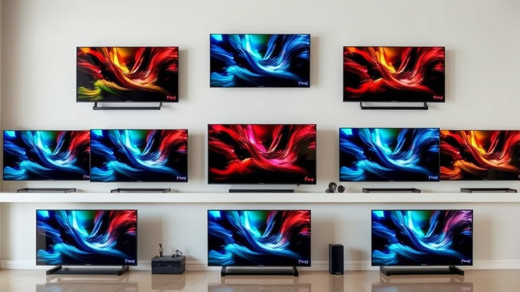 When evaluating premium Fire TV Edition smart TVs, sound quality often becomes a deciding factor in how immersive your viewing experience will be. Many high-end models feature Dolby Atmos and DTS Virtual-X, creating three-dimensional audio that surrounds you. Support for Dolby Digital Plus guarantees clear, multi-channel sound through built-in speakers or external systems. Features like Adaptive Sound or DTS Studio Sound optimize audio clarity and depth based on the content, enhancing overall quality. Smart controls allow me to customize sound settings, including equalizer adjustments and volume leveling, for a tailored experience. Additionally, these TVs often support external audio options such as HDMI ARC/eARC, Bluetooth speakers, or soundbars, making it easy to upgrade to premium surround sound and truly elevate my entertainment.