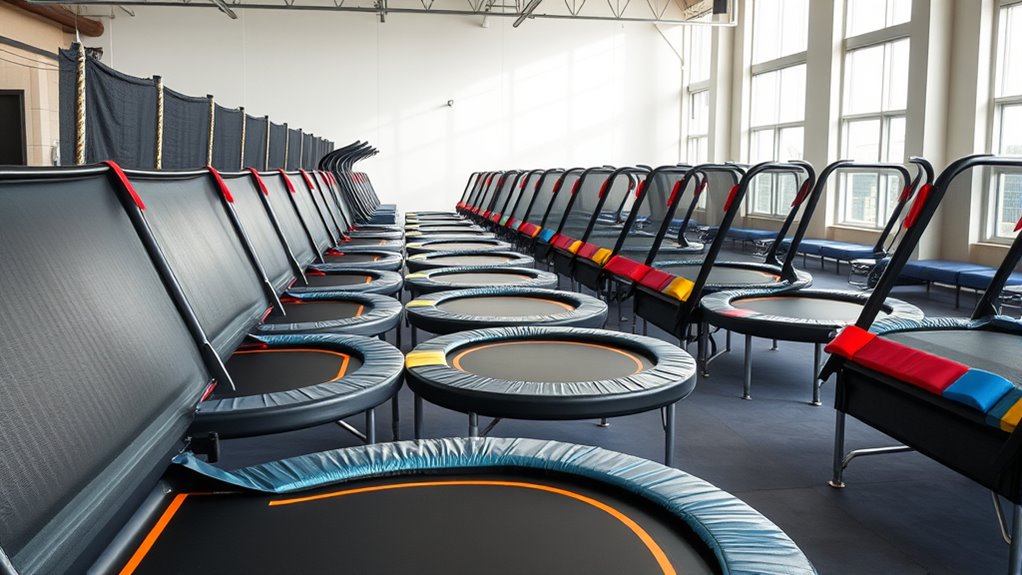 I always picture my workout space as a cozy corner, so I measure carefully before choosing a trampoline. To pick the right size, I consider the room’s dimensions, leaving enough clearance around the trampoline—at least 2 feet—to prevent accidents. If space is tight, a smaller model works, but I prefer a larger one for better bounce and comfort. Trust your measurements; it’s the key to a safe, enjoyable workout.