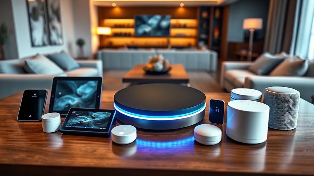 If you want to elevate your smart home, I recommend checking out top premium hubs like Hubitat Elevation, Homey Pro, SmartThings, and Philips Hue Bridge. They support multiple protocols like Zigbee, Z-Wave, and Wi-Fi, offering advanced automation, strong privacy, and broad device compatibility. Each hub has unique features, whether local control or cloud integration. Keep exploring to discover which one fits your setup best and release your smart home potential.