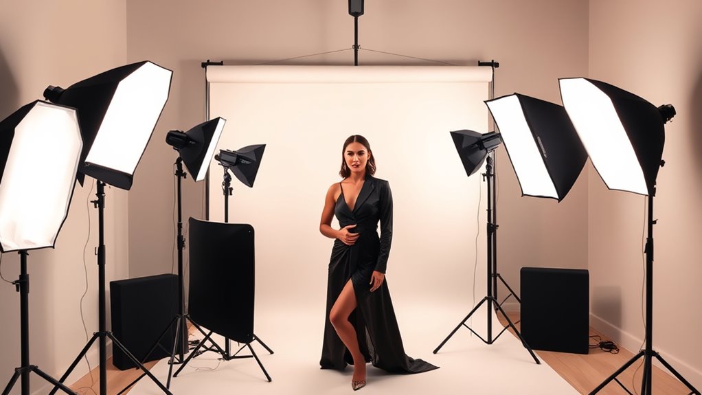 When selecting a premium studio lighting kit, I prioritize portability and easy storage to guarantee I can set up quickly and transport gear efficiently. Lightweight softboxes and compact tripod stands make it simple to carry everything on location. Foldable softboxes, telescoping stands, and carry bags are essential for quick packing and organized storage. Modular components that disassemble into smaller pieces help save space and enhance mobility. Portable kits often feature adjustable, collapsible tripods and softboxes with quick-release mechanisms, streamlining setup and breakdown. I also consider the overall weight of the entire kit, aiming for a balance between durability and lightweight design. This approach ensures I’m always ready to shoot without hassle, whether in-studio or on the go.