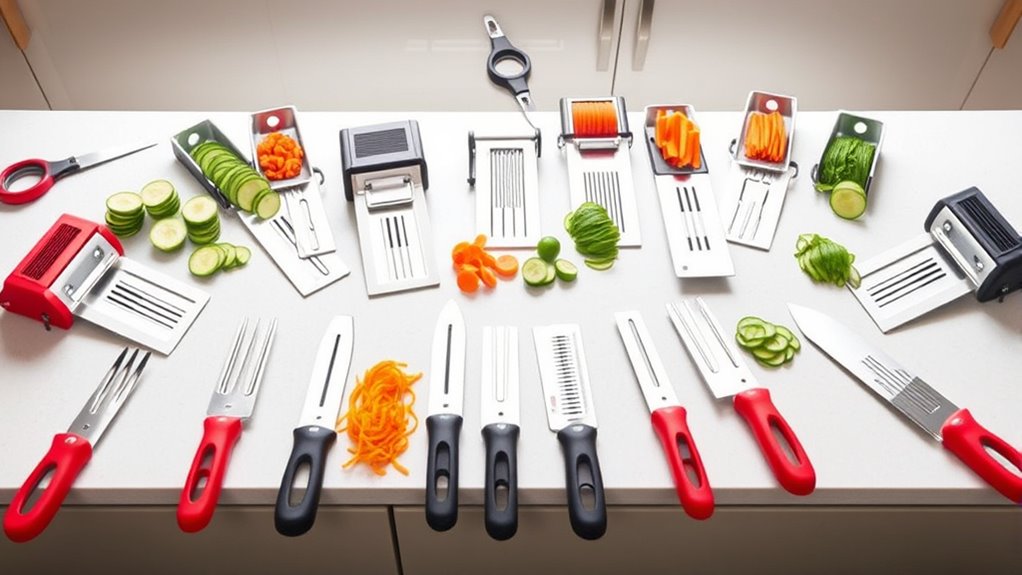 Did you know that 65% of mandoline accidents happen because of improper safety features? I always look for models with safety locks and non-slip bases, which greatly reduce the risk of slips and cuts. Many slicers now include hand guards that keep fingers away from blades, making the process safer and more comfortable. Investing in a mandoline with these features guarantees you can prep meals confidently and safely.