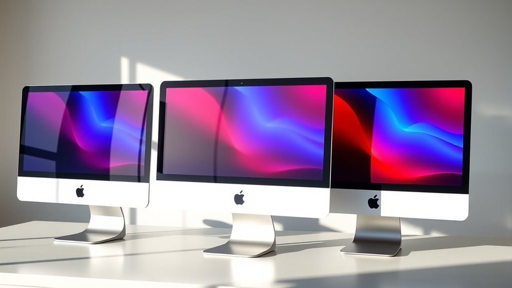 The display quality of a renewed iMac plays a essential role in delivering vibrant, sharp visuals that enhance my overall experience. A high-resolution 4.5K Retina display supports up to 1 billion colors, making images and videos look incredibly lifelike. Brightness levels around 500 nits improve visibility in various lighting conditions, ensuring I can work comfortably indoors or outdoors. Color accuracy and wide color gamut support add depth and richness to visuals, making everything appear more realistic. Nano-Texture Glass options reduce glare and improve clarity, especially during long viewing sessions. When choosing a renewed iMac, I always check the display’s calibration, ensuring there are no dead pixels or color inconsistencies. These factors are essential for a truly immersive and enjoyable display experience.