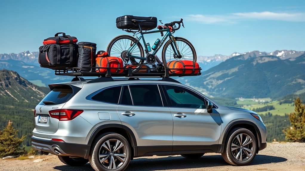 Choosing the right roof rack depends heavily on your vehicle’s type and configuration. I always check that the rack’s dimensions and weight capacity match my vehicle’s roof specifications to avoid damage or safety issues. It’s crucial to verify compatibility with your roof type, whether you have a bare roof, side rails, or existing crossbars, to ensure proper installation. I also consider if the system is adjustable or customizable, which helps accommodate different cargo sizes and shapes. Additionally, I make sure the roof rack is designed specifically for my vehicle’s make and model, or that it’s a universal fit with adaptable features. Finally, I confirm it includes or can be paired with the necessary mounting hardware and security features for safe, secure transport.