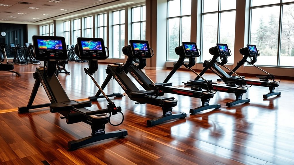 Digital tracking features have become essential for maximizing the effectiveness of full-body rowing workouts. They monitor key metrics like stroke count, calories burned, workout duration, and distance traveled in real-time, giving instant feedback. Many models also connect via Bluetooth to fitness apps, allowing me to track progress, set goals, and access virtual training sessions. The LCD or LED displays provide immediate updates, helping me stay motivated and maintain proper pacing. Advanced systems record historical workout data, so I can analyze my performance trends over time and adjust my training accordingly. Some rowing machines even include device holders, making it easy to view my smartphone or tablet for entertainment or guided workouts. These features guarantee I stay engaged and informed throughout each session.