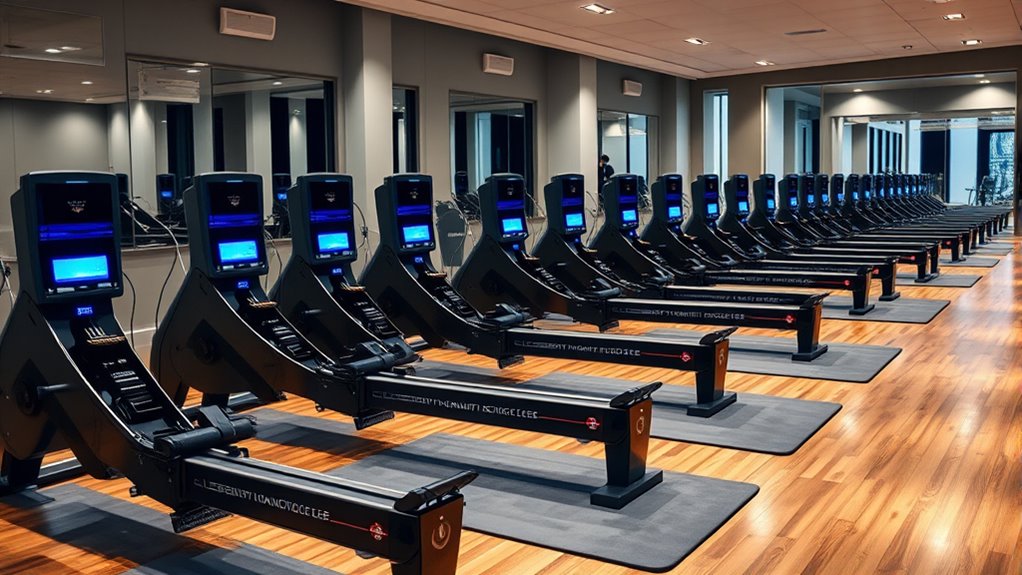 Evaluating your available space is key to selecting the right rowing machine for your home gym. Measure the area where you plan to place it, making sure there’s enough room for comfortable use. If space is limited, consider models that fold or have a compact design; some fold down to less than three square feet, perfect for small rooms or closets. Check the fully assembled dimensions to ensure it can pass through doorways easily and fit around furniture. Features like built-in wheels or vertical storage options make it simple to move and store the machine after your workout. Ultimately, choosing a machine that aligns with your space constraints helps keep your workout area organized and accessible, without sacrificing comfort or functionality.