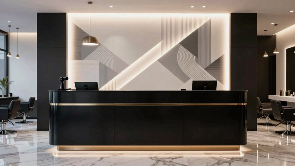 Choosing a salon reception desk that matches your overall interior design is essential to creating a cohesive and inviting space. The style should complement your decor, whether it’s modern, minimalist, or classic, to guarantee a seamless look. Pay attention to color schemes and finishes, such as white, black, or wood tones, that align with your branding and theme. Incorporating modern design elements like LED lighting, sleek lines, or unique features like barn doors can boost visual appeal and leave a strong impression. A contemporary desk often features clean, minimalist lines and smooth surfaces, which help create a professional yet welcoming atmosphere. Remember, style should balance form and function, enhancing the space while offering practical features like storage, lighting, and privacy.