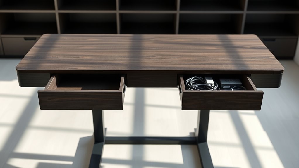 Selecting a sit-stand desk with sufficient storage capacity and the right type of drawers is crucial for maintaining an organized and efficient workspace. I recommend evaluating the number and size of drawers or compartments to guarantee they fit your essential supplies and devices comfortably. Consider whether you prefer fabric, wood, or metal drawers, as each offers different aesthetic and organizational benefits. Check if the storage includes specialized features like keyboard trays, cable management trays, or hidden compartments—these help keep your workspace clutter-free. It’s also important to confirm the storage supports your daily workload without reducing your usable surface area. Finally, assess how easily you can access and ergonomically reach the drawers, which directly impacts your workflow and comfort throughout the day.