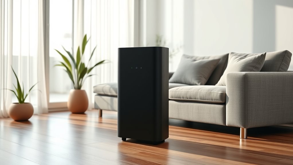 Choosing a smart air purifier that fits your room size is essential for effective air cleaning. You want to guarantee the device’s maximum coverage area matches or exceeds your room’s size. Check the Clean Air Delivery Rate (CADR) ratings, which indicate how quickly it can filter air in your space. Units tested and verified by independent organizations like AHAM give me confidence in their performance. If my room is larger, I might need a higher fan speed or even multiple units to keep the air fresh. It’s important to match the recommended room size with my actual space to avoid underperformance or wasting energy. Proper size compatibility guarantees the purifier works efficiently and keeps my air clean without unnecessary power consumption.