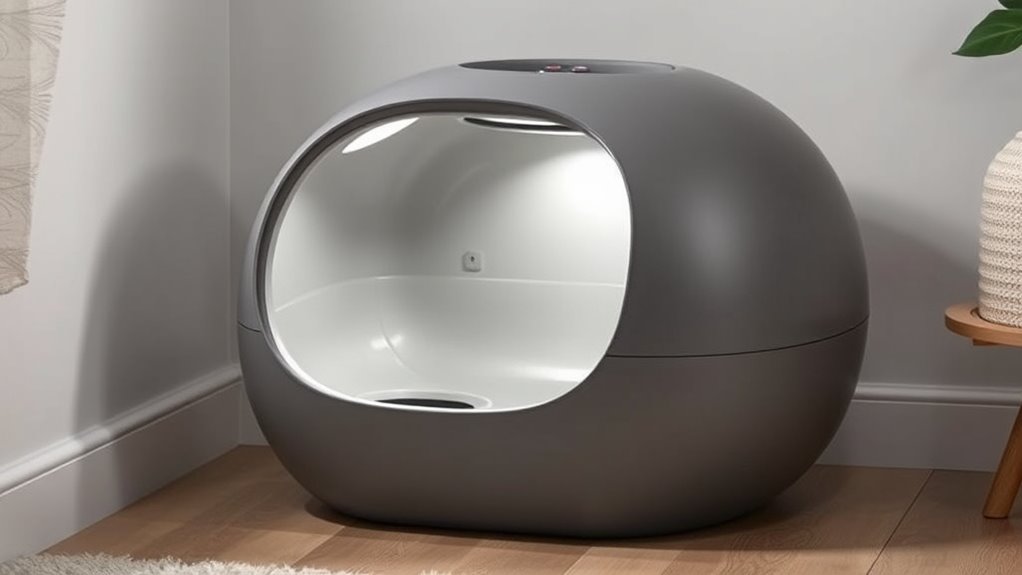 Did you know that multi-cat households can benefit greatly from a smart litter box? Yes, multiple cats can use a single smart litter box comfortably, especially when it’s designed with spaciousness and odor control in mind. I’ve found that many models automatically monitor usage and keep things clean, making it easier for multiple cats to share without issues. It’s a practical solution that keeps everyone happy and the house fresh.