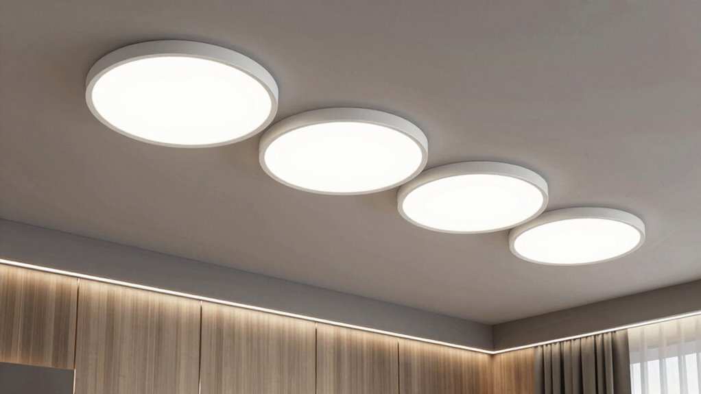 Selecting a smart ceiling light flush mount becomes much easier when you focus on models that feature straightforward installation and sleek design. Look for fixtures with clear instructions and minimal wiring requirements to simplify setup. Ultra-thin, flush mount designs work best for low ceilings or tight spaces, ensuring a seamless look. Make sure the fixture is compatible with common junction boxes, like 3.5/4 inch or 5/6 inch models, for versatility. Choosing lights made from fire-resistant or durable plastic adds safety and longevity. Additionally, opt for fixtures with simple control options, such as remote or app-based management, which eliminate the need for complex wiring or extra switches. These features make installation quick and the design sleek, blending functionality with style.