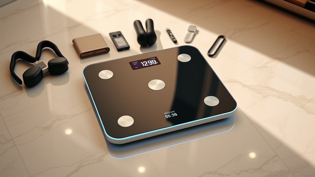 Beyond the scale’s build quality, the array of health metrics it measures can greatly enhance your understanding of your overall wellness. Many smart scales include features like visceral fat, skeletal muscle mass, body water, and metabolic age, offering an extensive health picture. Some models go further, providing data such as BMR, body type classification, and protein levels for a more detailed assessment. The number of metrics varies, with advanced scales offering over 20 data points to analyze. However, accurate readings depend on proper calibration, consistent measurement techniques, and good posture. Tracking these metrics over time helps identify trends, set personalized health goals, and evaluate the effectiveness of your diet and exercise routines, making your scale a valuable health companion.
