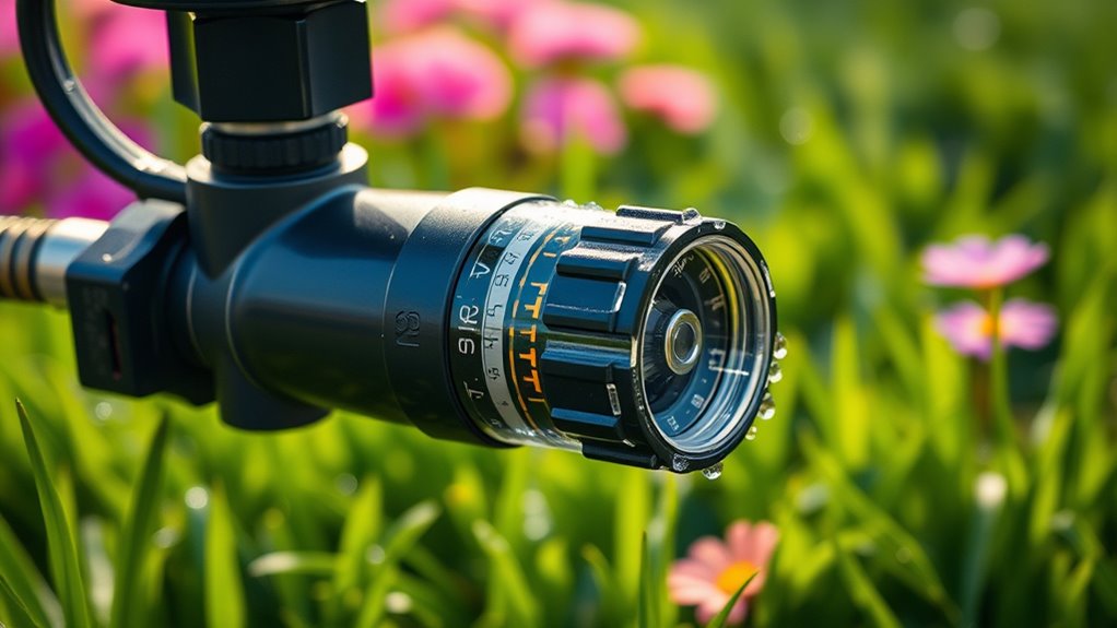 Choosing a smart sprinkler valve with a flow meter means making sure it can handle the water pressure in my system. I need to verify that the valve can tolerate typical pressures, usually up to 100-150 PSI, to avoid damage or malfunctions. Checking the manufacturer’s maximum pressure rating helps guarantee compatibility, especially if my water supply has high-pressure conditions. Valves made from reinforced materials like brass or stainless steel tend to offer better pressure tolerance than plastic models. It’s also wise to consider whether the valve includes built-in pressure regulation or can work with external pressure reducers. Ensuring that the components are rated for continuous operation under high pressure guarantees durability and reliable performance over time, which is essential for maintaining an efficient irrigation system.
