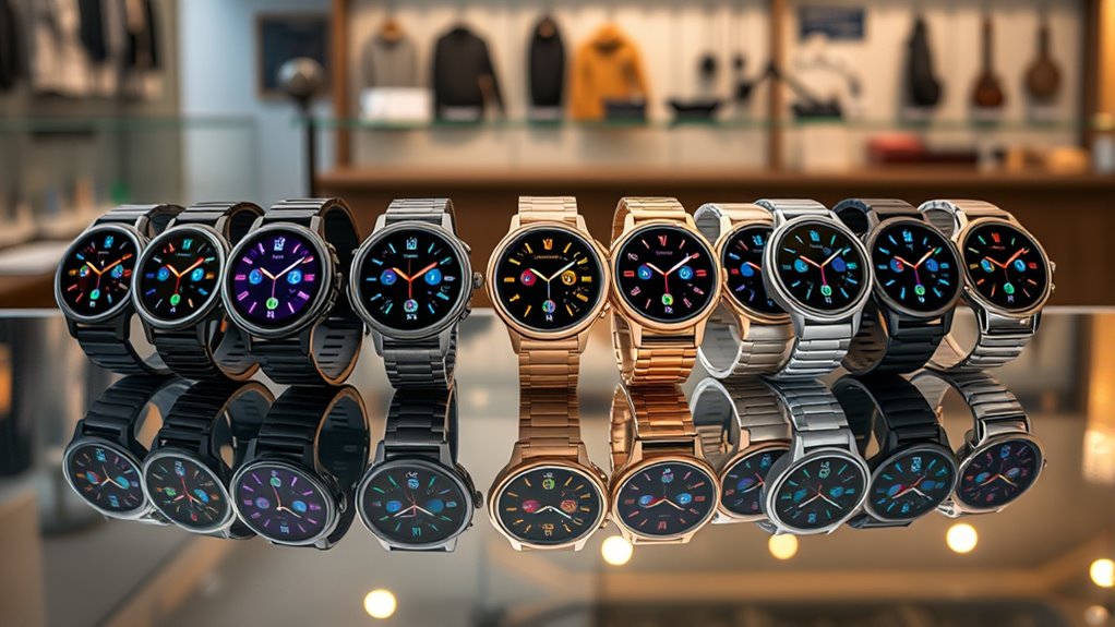 When selecting a smartwatch for Android, it’s important to take into account the design and style options to guarantee it complements your personal aesthetic. The variety of display shapes—square, round, and rectangular—allows you to match the watch to your style, whether sleek, sporty, or classic. Customizable watch faces and interchangeable bands give you the freedom to personalize for different occasions or moods. Build quality and materials, like aluminum, stainless steel, or plastic, influence durability and comfort for daily wear. Also, consider the size and weight of the watch, ensuring it fits comfortably without feeling bulky or fragile. Ultimately, choose a design that aligns with your lifestyle, whether you’re active, professional, or casual, to make your smartwatch an extension of your personal style.