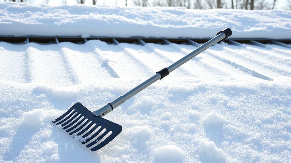 Protecting your metal roof during snow removal starts with the right rake features. I look for a snow rake with soft, non-abrasive blades made from foam or plastic to prevent scratching or damaging the surface. Additional protection comes from features like shingle or panel protectors, rollers, or shims that distribute pressure evenly and reduce direct contact. Flexible or adjustable blades help me gently clear snow without denting or scraping the metal coating. Ergonomic designs with anti-slip grips give me better control and reduce the risk of slips that could harm the roof. Smooth-edged rakes with rounded corners ensure safe operation, avoiding gouges or scratches on delicate finishes. These surface protection features are essential for safe, effective snow removal without compromising my roof’s integrity.