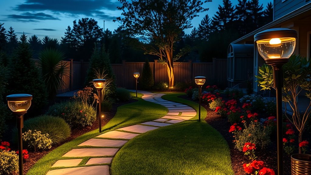 Choosing the right solar landscape lights with motion sensors is like planting a garden that blooms at night—each light a glowing flower guiding your way. With options ranging from waterproof spotlights to ground lights, you can craft an outdoor space that’s both beautiful and secure. Just remember, the best lights are the ones that shine when you need them most, turning your yard into a safe, inviting haven under the stars.