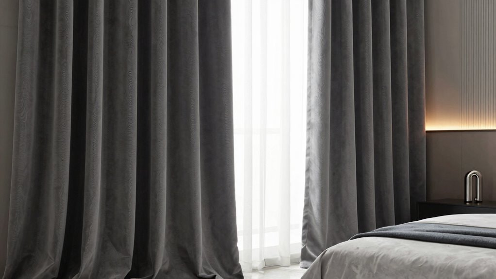 When evaluating soundproof curtains for your bedroom, it’s important to take into account their noise reduction capabilities, which are primarily determined by their material composition and construction. Curtains with multiple layered fabrics, like triple weave or added felt linings, usually offer better sound dampening than single-layer options. The level of noise reduction is often measured in decibels (dB), with premium curtains capable of reducing noise by 20-30 dB or more. Thicker, heavier fabrics increase mass and density, enhancing sound blocking. Additionally, specialized materials like acoustic felt or melt-blown fabric considerably improve noise minimization. Overall, higher-rated curtains provide more effective noise reduction by absorbing and blocking sound waves, making your bedroom a quieter, more peaceful retreat.
