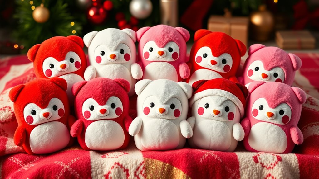 The collectibility of Squishmallows from the 2025 holiday series hinges on several key factors that influence their value over time. Limited edition releases, like holiday-themed characters, boost desirability among collectors and can increase resale value. Authenticity seals and official licensing are essential—they ensure the plush is genuine and help maintain its worth. Unique characters with detailed bios and personalities also add to their rarity, making them more attractive to collectors. The size and edition, such as 8-inch or 12-inch limited runs, impact their overall value. Ultimately, exclusive holiday designs, like Christmas or seasonal characters, are more sought-after, often becoming prized collectibles. Considering these factors can help you choose Squishmallows that will hold or increase their value over time.