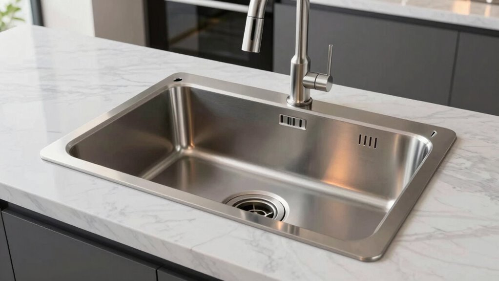 I’d say the ideal thickness for durability is around 16-gauge steel. Think of it as the backbone of your sink—strong enough to withstand daily wear and tear without feeling like a fragile whisper. Thinner gauges, like 18 or 20, might look sleek but can dent easily. With 16-gauge, you’ll get a resilient, long-lasting surface that keeps your kitchen shining and sturdy for years to come.