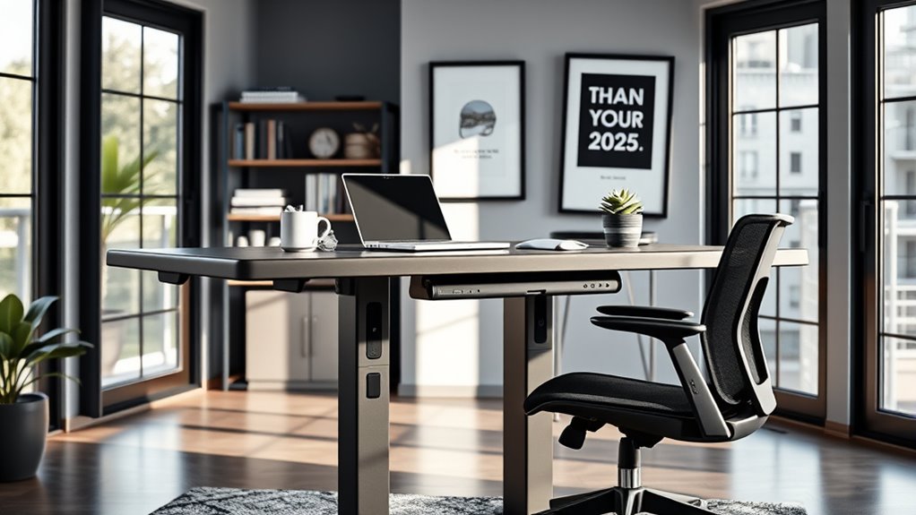 If you’re looking for the 15 best electric standing desks for comfort and productivity in 2025, I’ve found top options that combine sturdy build, ergonomic features, and adjustable heights up to 50 inches. These desks support multiple monitors, heavy equipment, and include features like programmable presets, quiet motors, and organized surfaces. They’re perfect for creating a flexible workspace that boosts efficiency. Keep exploring to find out which models stand out and suit your needs best.