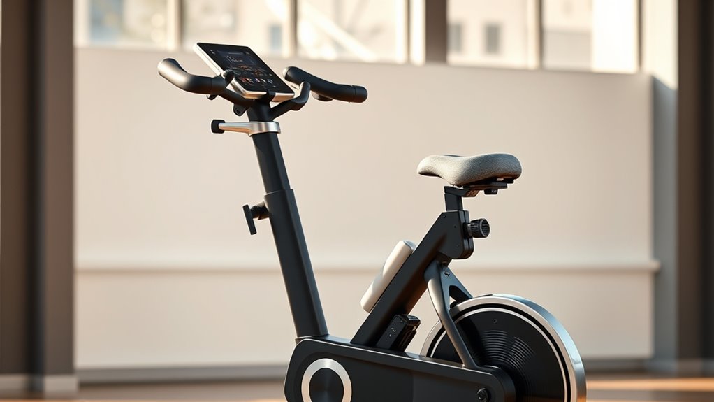Adjustability features are essential for ensuring a comfortable and effective workout, especially since everyone has different body types and preferences. Adjustable handlebars and seats allow me to customize the fit, guaranteeing proper posture and reducing strain. Multi-directional adjustments let me target different muscle groups and switch riding positions easily. Multiple adjustment points make fine-tuning quick and straightforward, so I can find the perfect setup without hassle. Precise control over seat fore-aft positioning and handlebar height enhances ergonomics, minimizing injury risk and maximizing comfort. I appreciate bikes with easy-to-use mechanisms like quick-release levers or micro-adjustment knobs, which let me make quick adjustments without interrupting my session. Overall, flexible adjustability ensures my workout remains comfortable, safe, and tailored to my needs.