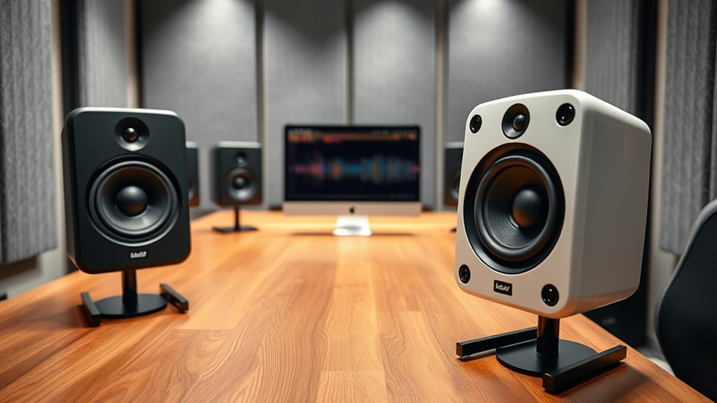 If you’re searching for the 15 best studio monitor speakers for perfect sound clarity in 2025, I can help. I’ve explored options from compact budget-friendly choices like the PreSonus Eris 3.5 to professional-grade models like Yamaha HS5 and ADAM D3V. These monitors offer accurate sound, versatile connectivity, and sleek designs perfect for various setups. Keep going, and you’ll uncover detailed insights to pick the ideal speakers for your needs.