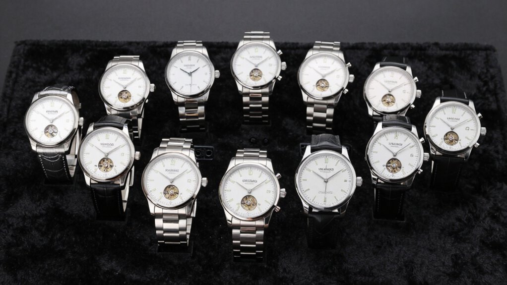 When selecting a Swiss automatic watch under $2000, the variety of design and style options plays a key role in matching your personal taste and lifestyle. You’ll find watches ranging from sporty to dressy, with vintage-inspired touches that add character. Dial designs vary from minimalist to intricate chronographs, moonphase displays, and wave textures, giving you plenty of choices. Material options include stainless steel, titanium, rubber, and leather straps, each offering a different look and feel. Sizes range from compact 38mm to bold 47mm cases, ensuring a comfortable fit for any wrist. Many models feature striking details like bold indices, colorful dials, and distinctive bezels, allowing you to express your style while keeping within budget.