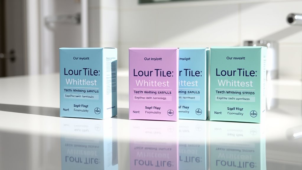Ensuring application comfort is crucial when selecting teeth whitening strips for sensitive teeth. I look for strips specifically formulated for sensitivity, often containing desensitizing ingredients like potassium nitrate or hydroxyapatite, to reduce discomfort. A non-slip, ergonomic design is essential, as it guarantees a secure fit that feels comfortable during application. I also prefer strips with a lower peroxide concentration, which minimizes gum irritation and overall sensitivity. Choosing products free from harsh chemicals and artificial additives helps prevent further issues. Additionally, I prioritize strips that offer a quick and straightforward application process, making the experience hassle-free without sacrificing comfort. Overall, a comfortable fit and gentle formula make the whitening process more pleasant and less invasive for sensitive teeth.