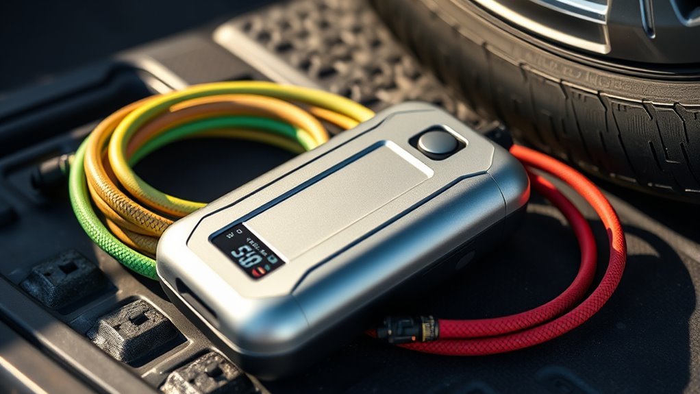 A tire inflator’s battery capacity directly affects how many tires or inflatables you can pump before needing a recharge. A higher capacity, measured in milliamp-hours (mAh), means more inflation cycles per charge. I recommend choosing a device with at least 10,000mAh if you plan to inflate multiple tires or use it outdoors for extended periods. Larger batteries provide longer usage, allowing you to inflate several tires, bikes, or sports balls without recharging. Keep in mind, though, that bigger batteries may take longer to recharge, but they offer greater convenience and independence, especially in emergencies where power sources are limited. Battery capacity is a key factor in ensuring your inflator remains reliable and ready when you need it most.