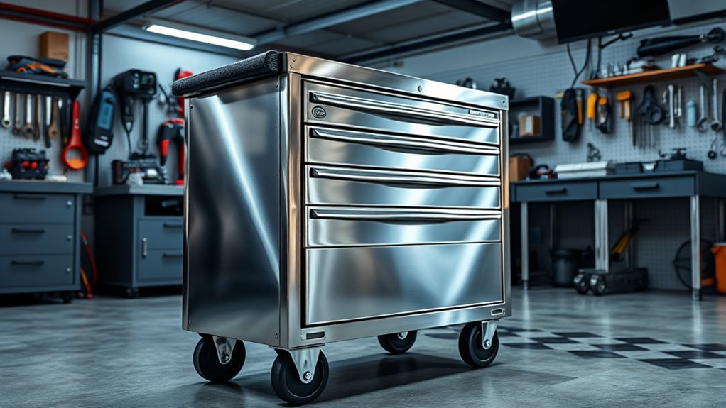 Adding the right accessories can considerably improve the functionality and convenience of your rolling tool chest. Drawer liners help prevent tools from slipping and protect surfaces, while locks and padlock eyelets enhance security for valuable tools. Caster brakes keep your chest stationary during use, ensuring safety. Side hooks, pegboards, and tool racks increase storage versatility, making frequently used tools more accessible. Magnetic strips or tool panels are perfect for small metal parts and hand tools, keeping them within easy reach. Customizable options like removable shelves and adjustable compartments let you tailor the chest to your specific needs. These accessories not only boost organization but also improve mobility, security, and efficiency, making your investment truly worth it in the long run.
