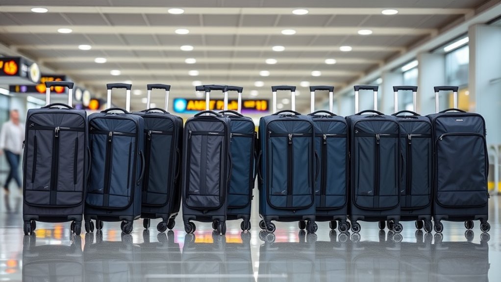 Choosing a travel garment bag with wheels requires careful attention to airline size and weight restrictions to avoid issues during boarding or baggage handling. I always double-check that the bag’s dimensions fit within airline guidelines, usually around 22 x 14 x 9 inches for carry-ons. It’s also important to verify the weight limit, which can range from 15 to 50 pounds, depending on the carrier. I look for bags with secure attachment features like straps or sleeves to attach to rolling luggage easily and keep everything in place. When fully packed or expanded, the bag should still meet size restrictions. Ultimately, I review airline policies for garment bags, especially for formal wear, to ensure my bag style and construction are acceptable on board or in checked luggage.