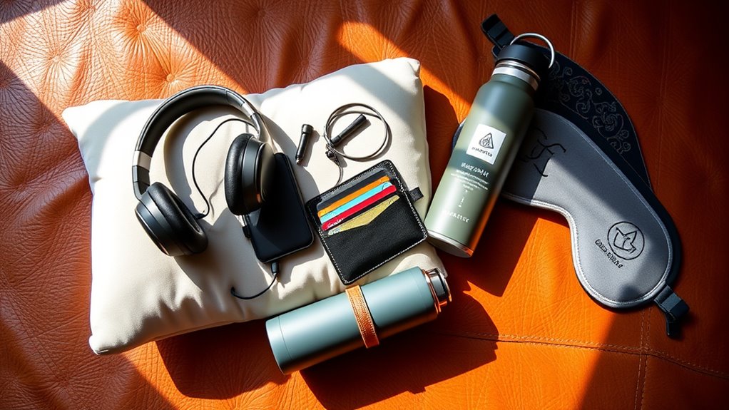 If you want to make frequent flying easier and more enjoyable, I recommend practical accessories like a seat back organizer and a portable travel station to keep essentials close and tidy. Comfort items like ergonomic neck pillows, plus fun touches like travel-themed socks, really help relax and add personality. Personalized gifts such as candles and organizers make trips special. Keep in mind the importance of lightweight, durable designs that fit seamlessly into travel routines. If you stay tuned, you’ll discover detailed tips to choose the best options.