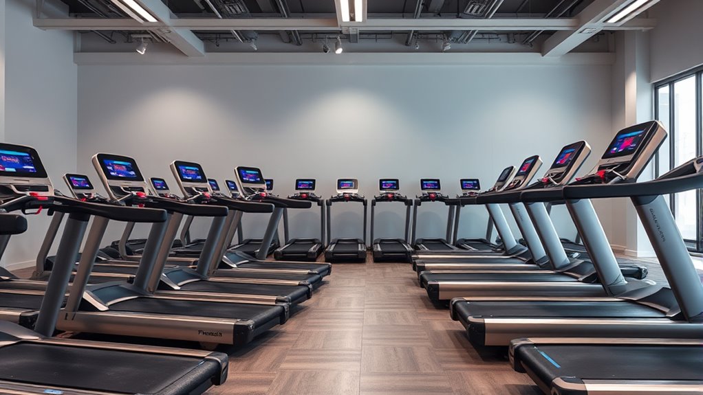To keep your high-tech treadmill lasting, I recommend regular cleaning of the deck and sensors to prevent dust buildup. Lubricate the belt as instructed to reduce wear and guarantee smooth operation. Check and tighten bolts periodically, and keep the motor vents clear of debris. Also, follow the manufacturer’s maintenance schedule and update software when prompted. A little routine care goes a long way in maintaining peak performance and extending your treadmill’s lifespan.