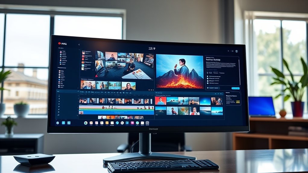 Choosing the right ultrawide monitor can transform your editing and multitasking experience—think of it as having your own holodeck in 2025. Whether you prefer stunning 4K visuals, vibrant color accuracy, or versatile connectivity, there’s a perfect fit out there. Don’t settle for less; embrace these expansive screens and elevate your workflow. After all, in a world where screens are king, the right monitor is your Excalibur.