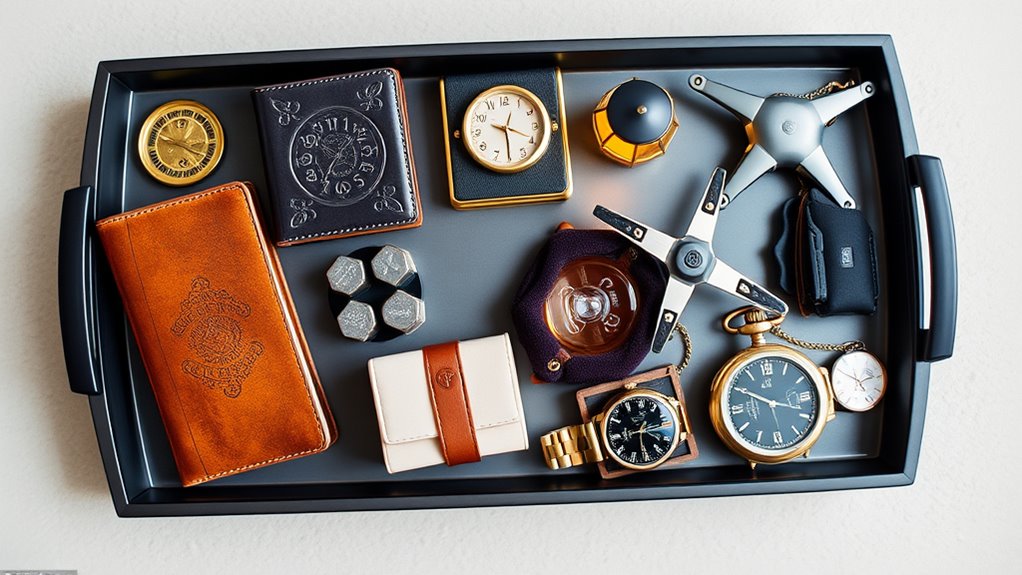 Choosing a gift for the man who has everything means prioritizing quality and craftsmanship, as these elements guarantee the item’s longevity and appeal. Superior materials and meticulous attention to detail guarantee durability, making the gift not just special but lasting. Handcrafted pieces often showcase unique imperfections and artisanal techniques, giving each item its own character. Using ethically sourced, sustainable materials also reflects a commitment to quality and environmental responsibility. Precise finishing touches, like laser engraving or hand stitching, enhance both aesthetic appeal and craftsmanship, demonstrating skill and care. Well-made gifts are designed to perform over time, maintaining their appearance and functionality even with regular use. Focusing on quality and craftsmanship ensures your gift stands out as a true reflection of thoughtfulness and excellence.