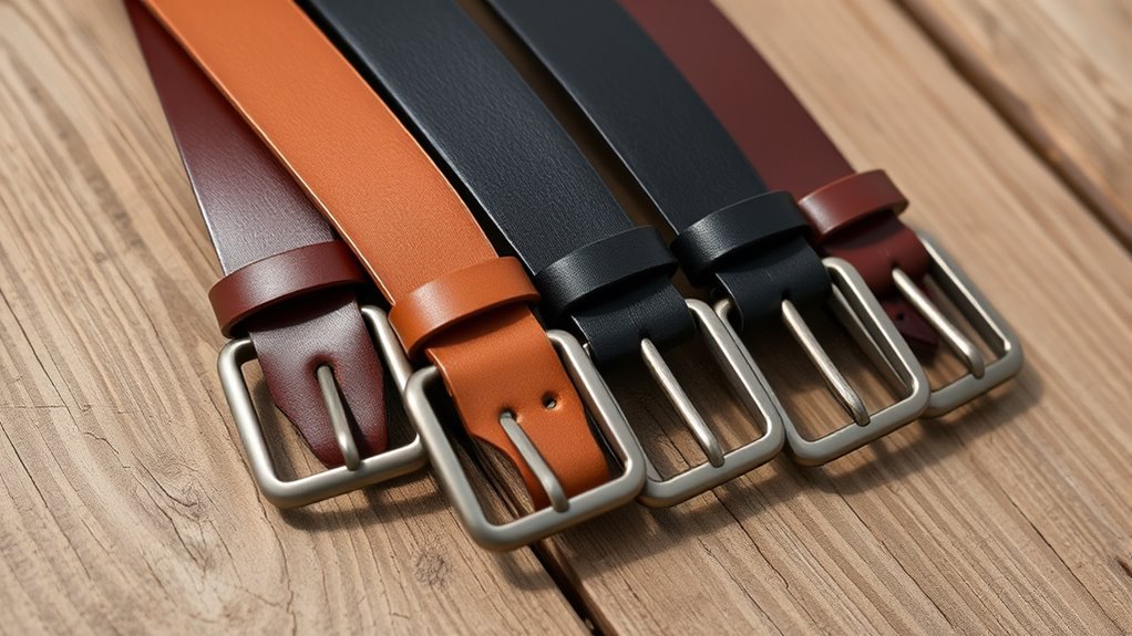 Choosing a vegan leather belt often comes down to the quality of the materials and how they feel against your skin. High-quality options typically use microfiber, cork, or bonded leather that closely resemble genuine leather in texture and appearance. The feel of a premium vegan leather belt is usually smooth, supple, and luxurious, offering a comfortable experience. Durability is a vital factor—top-tier materials resist cracking, fraying, and peeling, ensuring longevity. The weight and rigidity of the belt can also indicate craftsmanship; thicker, heavier belts often reflect better quality. Additionally, the tactile sensation—softness and flexibility—varies based on manufacturing processes and materials used, affecting both comfort and aesthetic appeal. Prioritizing these aspects helps you find a belt that’s both stylish and built to last.
