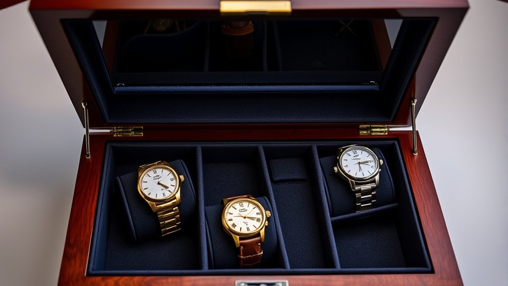 Watch boxes protect against moisture and humidity by using materials like cedar, silica gel packs, and airtight seals that absorb or block moisture. I always look for boxes with proper ventilation and desiccants to keep my watches dry. These features prevent rust, mold, and damage, ensuring my collection stays pristine and functional over time. Proper storage truly makes a difference in preserving the quality of my timepieces.