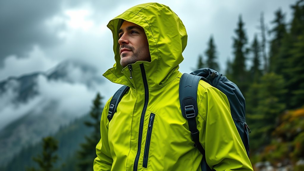 Choosing a waterproof hiking jacket hinges on the quality of its waterproof material, which directly impacts its performance and durability. High-quality fabrics like Gore-Tex, eVent, or proprietary coatings effectively block water while still allowing moisture vapor to escape, keeping you dry and comfortable. Look for jackets with a minimum hydrostatic head rating of 5,000mm, indicating strong resistance to heavy rain. Seam sealing and taped seams are *essential* in preventing water from seeping in at stitch points; the better the seam quality, the more reliable the jacket. Additionally, durable materials resist wear from washing, UV exposure, and daily use, ensuring long-lasting protection. Prioritizing high-quality waterproof fabrics guarantees that your jacket will perform well in challenging weather conditions and stand the test of time.