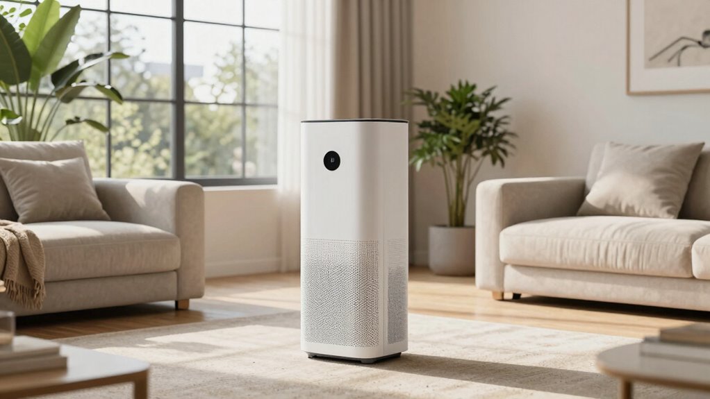 Think of your air purifier filters like the filters in your coffee maker—they need regular changing to keep things fresh. I usually replace mine every 6 to 12 months, depending on usage and air quality. Regular maintenance guarantees peak performance and air quality. Keep an eye on the filter indicator, and if it’s dirty or the airflow decreases, it’s time for a change. Proper upkeep keeps your home breathing easy.