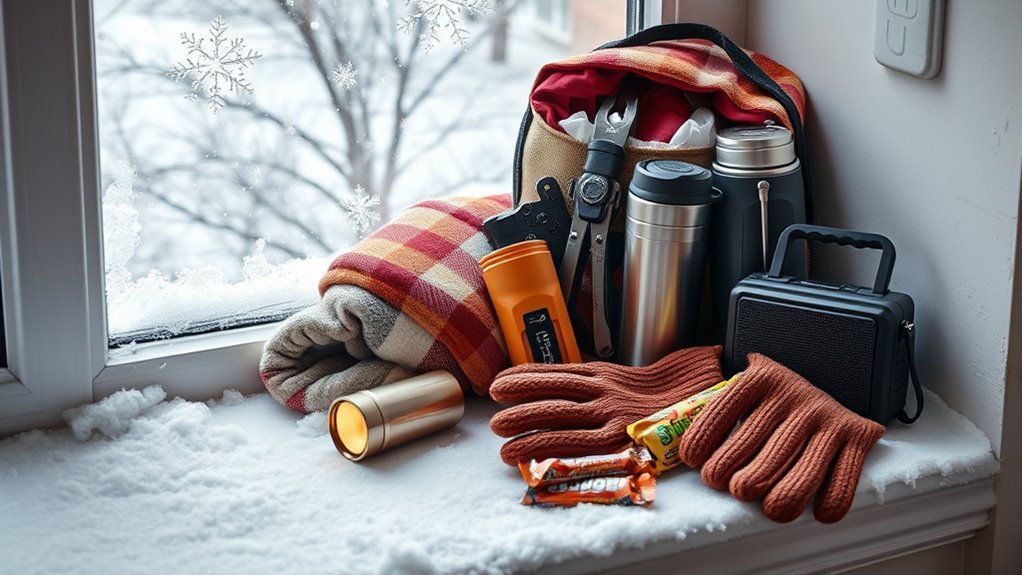 When winter storms strike, I make sure to have essential supplies like thermal emergency blankets to keep warm, a reliable flashlight with extra batteries, and a well-stocked emergency kit with first aid items and food. A weatherproof shelter or bivvy sack, portable power sources, and warm clothing are also vital. Staying prepared with these items can make all the difference, and if you stay tuned, you’ll discover even more must-have gear to stay safe.