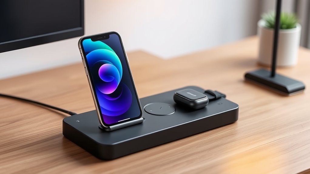 If you’re looking for the 15 best wireless charging stations that support three devices at once, I’ve got you covered. These stations combine convenience and efficiency by charging your iPhone, Apple Watch, and AirPods simultaneously with fast speeds and sleek designs. Many feature foldable, portable, or multi-function setups with safety protections. Keep exploring further—there’s plenty of options available that can match your style and tech needs seamlessly.