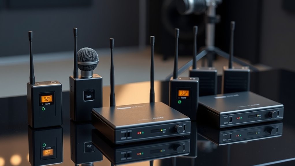 Interference can seriously compromise the performance of wireless lavalier microphones, especially in environments crowded with other wireless devices. To minimize this, I recommend systems operating on frequencies with less congestion, like UHF bands, which tend to resist interference better than VHF. Look for systems with automatic frequency scanning and switching features; these can dynamically find clear channels, ensuring a stable connection. Digital or encrypted signals also boost resistance to interference and jamming compared to analog systems. Proper placement of external antennas and strategic positioning of transmitters and receivers further reduce signal dropouts caused by environmental factors. Selecting a system with these features helps maintain crisp, clear sound quality even in challenging settings, giving you peace of mind during important recordings or live events.