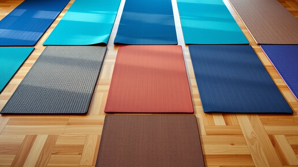 Choosing the right non-slip surface material is essential for maintaining stability and safety during your yoga practice. Textured rubber, TPE, and coated PVC are common materials designed to improve grip and prevent slips. The textured patterns on these mats increase traction by creating more friction between the mat and your skin or footwear, especially during challenging poses. Coatings like stay-dry or sticky finishes help wick away sweat, reducing moisture buildup that can cause slipping. Mats with double-sided non-slip surfaces offer added stability, which is particularly useful during hot or dynamic sessions. The quality and design of the surface texture are vital because they directly impact slip resistance, ensuring you stay grounded and safe throughout your practice.